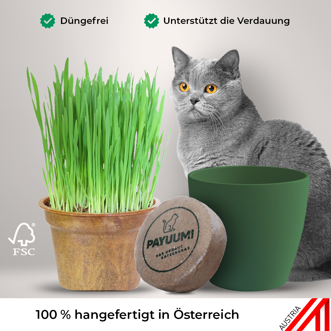 Die Payuumi Starter-Box enthält ein Katzengras-Pad, einen kompostierbaren Pflanztopf und einen passenden Übertopf, wählbar in 3 Farben - Perlmutt (weiß), Steinoptik (hellgrau), oder Moosgrün. Mit der Payuumi Starter-Box steht dir und dem Katzengras nur noch eine Sache im Weg: die Bestellung!