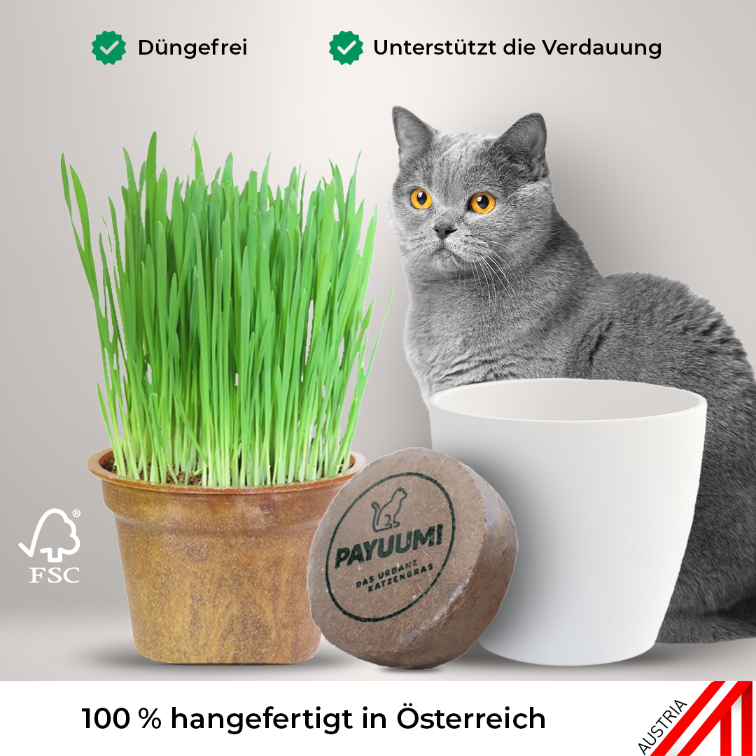Payuumi Katzengras keimt bei Zimmertemperatur. Erst ab dem 10. Tag ist gemäßigtes Gießen erforderlich. Um Wurzelfäule zu vermeiden, überschüssiges Wasser wegleeren. Tägliches Besprühen mit Wasser hält das Gras frisch und knackig. Wenn das Katzengras hoch gewachsen ist und deshalb zu knicken beginnt oder die Spitzen gelb werden, kann es auf ca. 10 cm zurückgeschnitten werden.