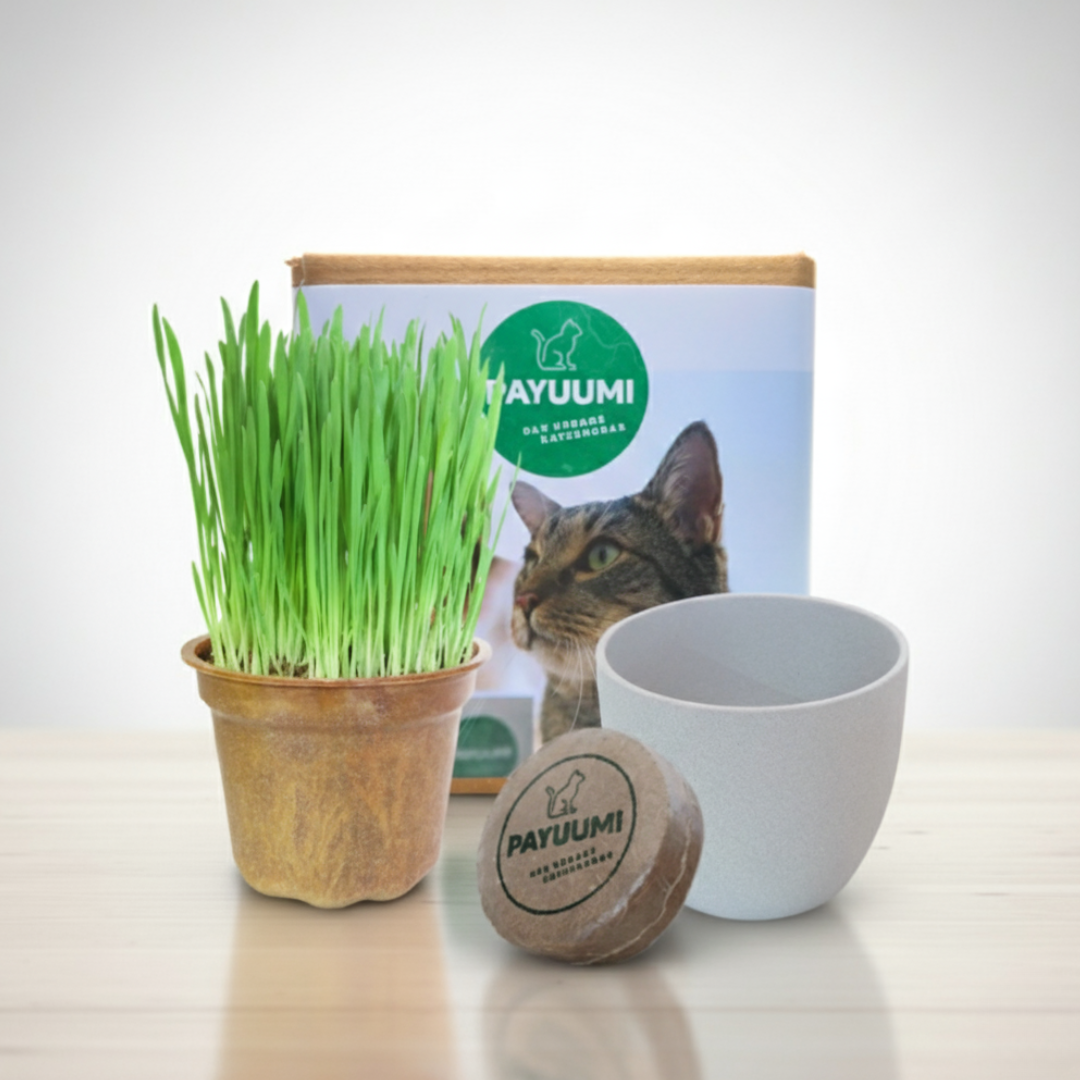 Die Payuumi Starter-Box enthält ein Katzengras-Pad, einen kompostierbaren Pflanztopf (ein Mal verwendbar) und einen passenden Übertopf, wählbar in 3 Farben - Perlmutt (weiß), Steinoptik (hellgrau), oder Moosgrün. Mit der Payuumi Starter-Box steht dir und dem Katzengras nur noch eine Sache im Weg: die Bestellung!